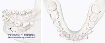 Direct bond buttons are especially helpful when addressing severely rotated teeth, commonly canines and premolars. In these cases, dual cutouts can be designed during digital treatment planning to create a coupling effect that enhances the force system of the aligners (Figs. 6a and b).