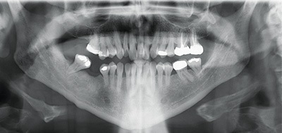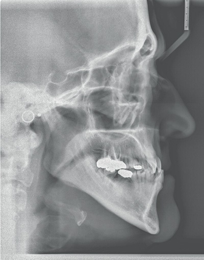 Diagnosing from “outside-in,” she showed lower 1/3 vertical facial height in slight excess, a prominent chin and mild mandibular asymmetry to the right. Unfavorable dark triangles are obvious in her smile because of periodontal recession. She shows only mild Class III occlusion, but a significant number of teeth are in full crossbite position. Notable cephalometric findings include mild mandibular prognathism, a high mandibular plane angle and lower incisors that are slightly compensated/upright as you might expect with a Class III excess mandible. Multiple areas of varying bone loss are present and the LR8 was given a poor long-term prognosis by the dentist.