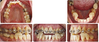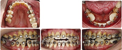 Instead, the turbos were placed on the lower canines and first bicuspids. These teeth, and the maxillary canines that would abut them, showed relatively good periodontal support and longer roots. They could likely shoulder the concentrated masticatory load in this periodontally compromised patient for more than a few months of treatment if needed. Also the turbos were shaped into a ramp (they sloped in to the lingual) to give function to their form. As the maxillary canines (which were in crossbite) hit the ramps, there would be a labial crown-tipping effect to jump their position out of crossbite as the maxillary teeth aligned. Crossbite elastics also played an important role in this regard as well.