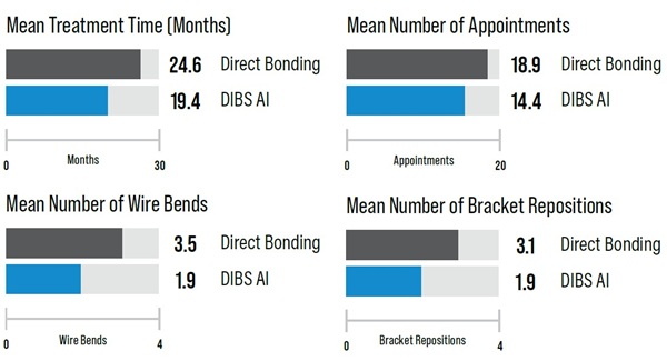 DIBS AI digital bonding demonstrated substantial efficiency gains, including a 21.1% reduction in overall treatment time (19.4 vs 24.6 months), a 23.8% reduction in office visits (14.4 vs 18.9 visits), a 46.0% reduction in wire bends, and a 40.1% reduction in bracket repositions (all p<0.001). In addition to lower mean values, DIBS AI cases exhibited significantly reduced variability across all measured outcomes.