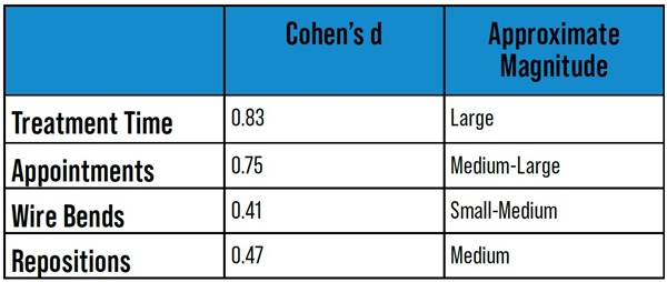 Compared with direct bonding, DIBS AI demonstrated a large reduction in treatment time (d=0.83), a medium-to-large reduction in the number of appointments (d=0.75), medium reduction in bracket repositions (d=0.47), and small-to-medium reduction in wire bends (d=0.41).