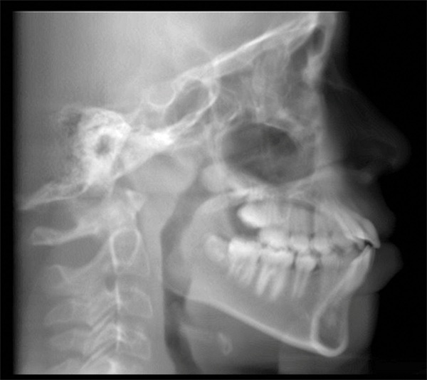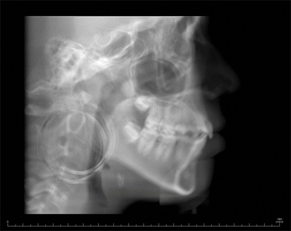 The final panoramic radiograph showed acceptable root positioning with no obvious radiographic evidence of significant adverse effects from treatment (Fig. 6). The final lateral cephalometric radiograph showed reduction in the protrusion of the incisors (Fig. 7). This reduction in incisor prominence was accompanied by a softer profile, more relaxed lips, and correction of the mentalis strain.