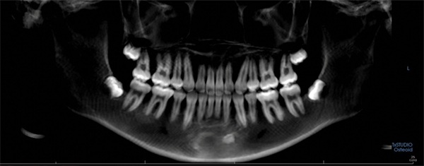 Pretreatment records included extraoral and intraoral photographs, a panoramic radiograph, and a lateral cephalometric radiograph. The panoramic radiograph showed the permanent dentition with no obvious generalized pathology and acceptable root form before treatment (Fig. 2). The dentition was otherwise suitable for comprehensive orthodontic treatment.