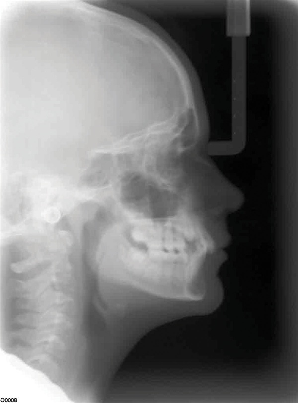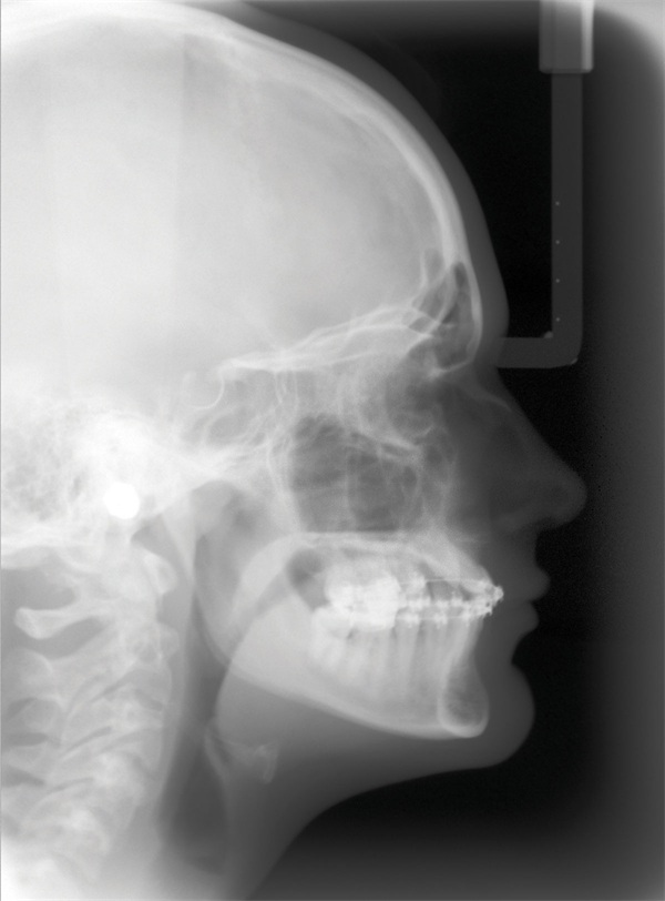 Updated records told a different story. The upper right canine remained fully unerupted, and significant adverse canting of both arches had developed on the right side (Figs. 4–6). Root shortening was visible on the upper right canine, lateral, and central incisors, likely a consequence of prior reluxation attempts to encourage eruption. The upper incisors had also become markedly more proclined over the course of treatment, a known risk when ectopic canines prove resistant to traction. Comparing the pre-treatment and current lateral cephalometric radiographs illustrated just how much incisor angulation had shifted (Figs. 2, 10). Facial photographs suggested some lower-third asymmetry with a right-side deviation, though the lower arch canting appeared to have partially self-corrected after vertical elastics were discontinued (Figs. 7–8).
