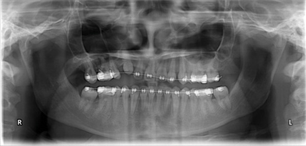 There was broad agreement on the starting point. Bracket repositioning was the first priority—bracket positions across the upper anterior segment were widely considered inappropriate for the current stage of treatment, and several contributors flagged the lower arch brackets as well. From there, the recommendation was to level and align into a heavy heat-treated stainless steel wire across the upper arch, a step that should begin correcting the cant and establish a more stable foundation before attempting canine traction. A stepped-down wire segment from the upper right second premolar to the upper left lateral incisor, combined with a piggybacked NiTi overlay tied with O-ties, would allow light continuous force to be applied to the upper right canine once the arch was better leveled. Running the lower arch in a comparable wire and using bilateral Class I triangle elastics was suggested to support canine eruption while guarding against cant recurrence on the contralateral side (Fig. 9).